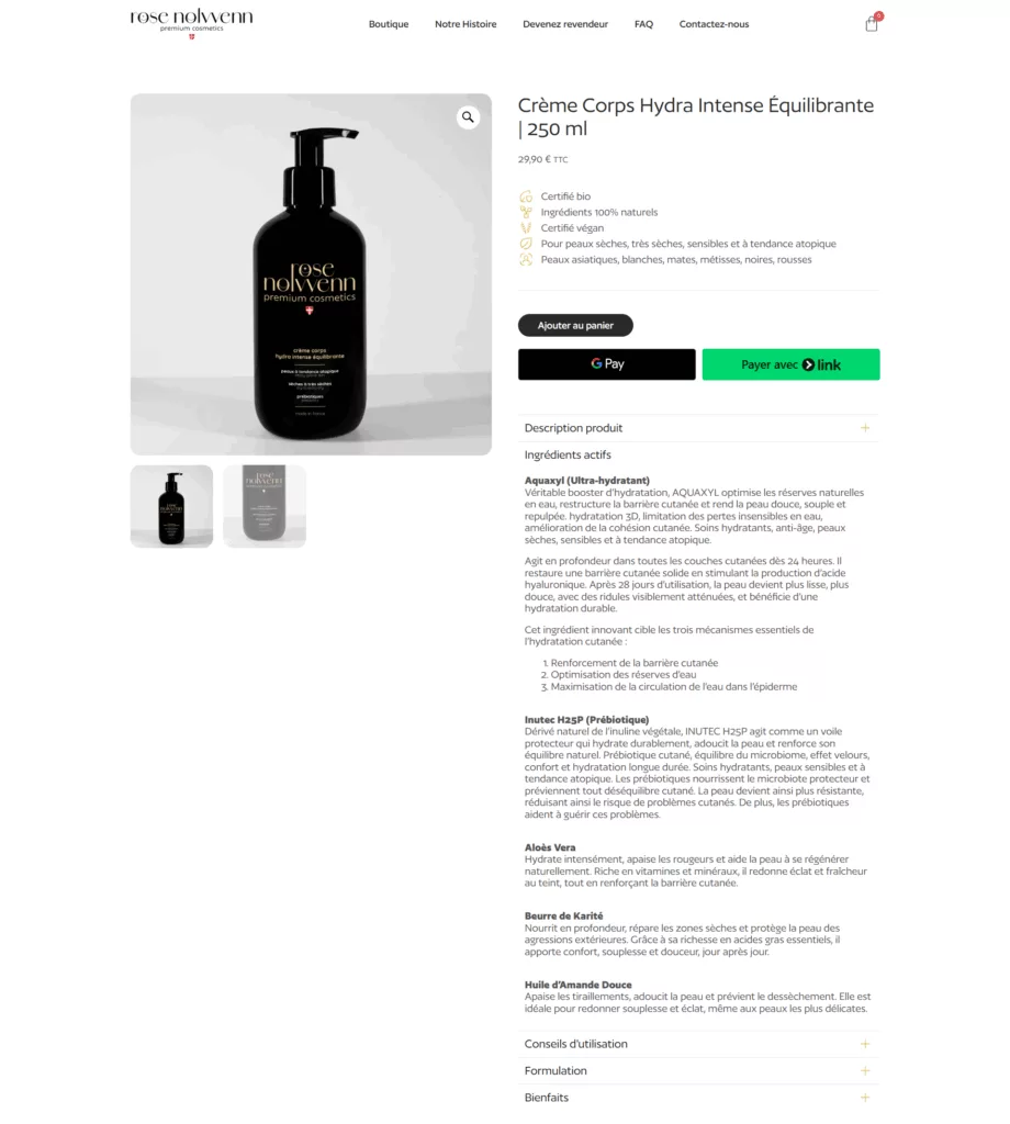 La rédaction des fiches produits m’a également été confiée. Volontairement synthétiques et épurées, ces fiches mettent en avant les ingrédients actifs innovants et leur bienfaits.